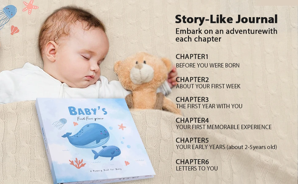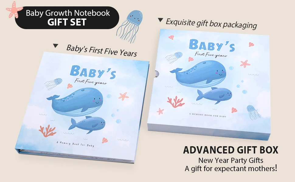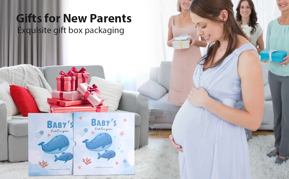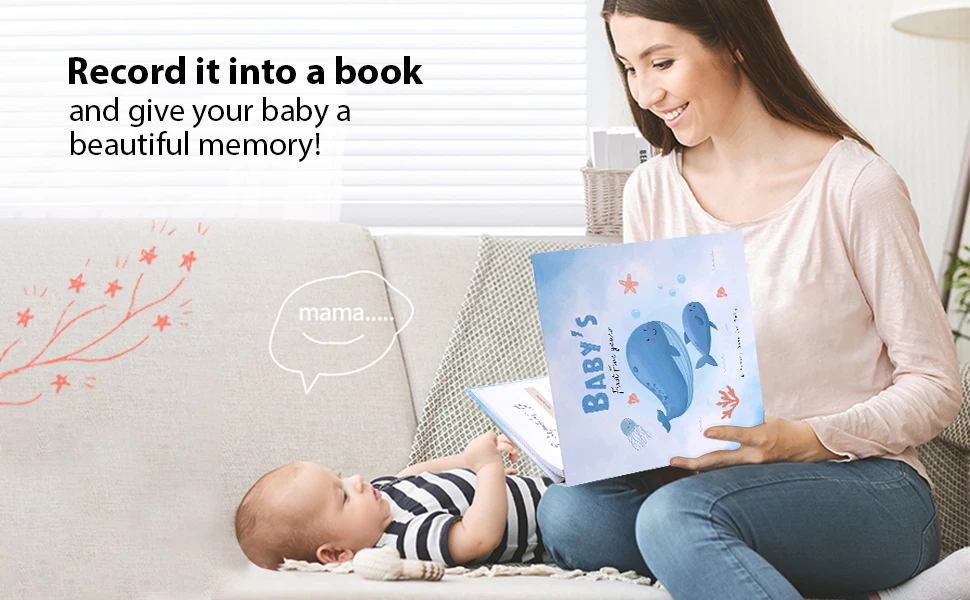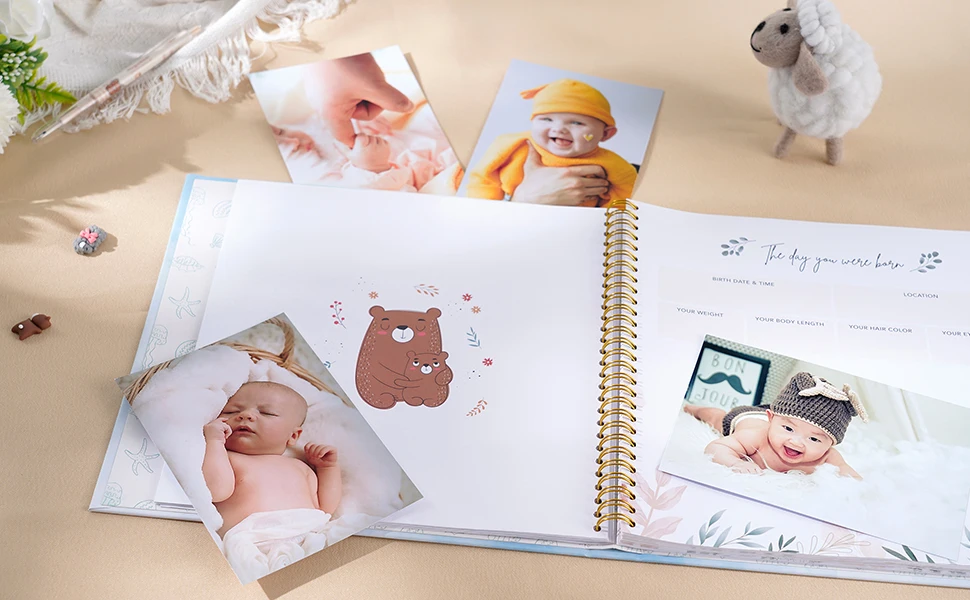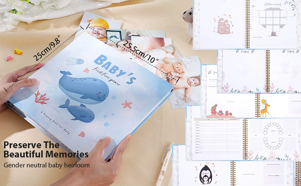 Our beautiful baby memory book will help you to create the perfect baby keepsake for your baby boy or baby girl. New parents are guided through the first year of the child's journey with photo and writing spaces to document monthly birthday pages, and records ultrasound pictures, baby showers, growth chat and first bubble bath and so much more!